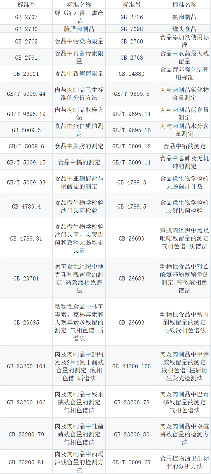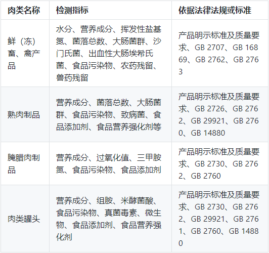 各类肉类检测指标及标准依据对照表